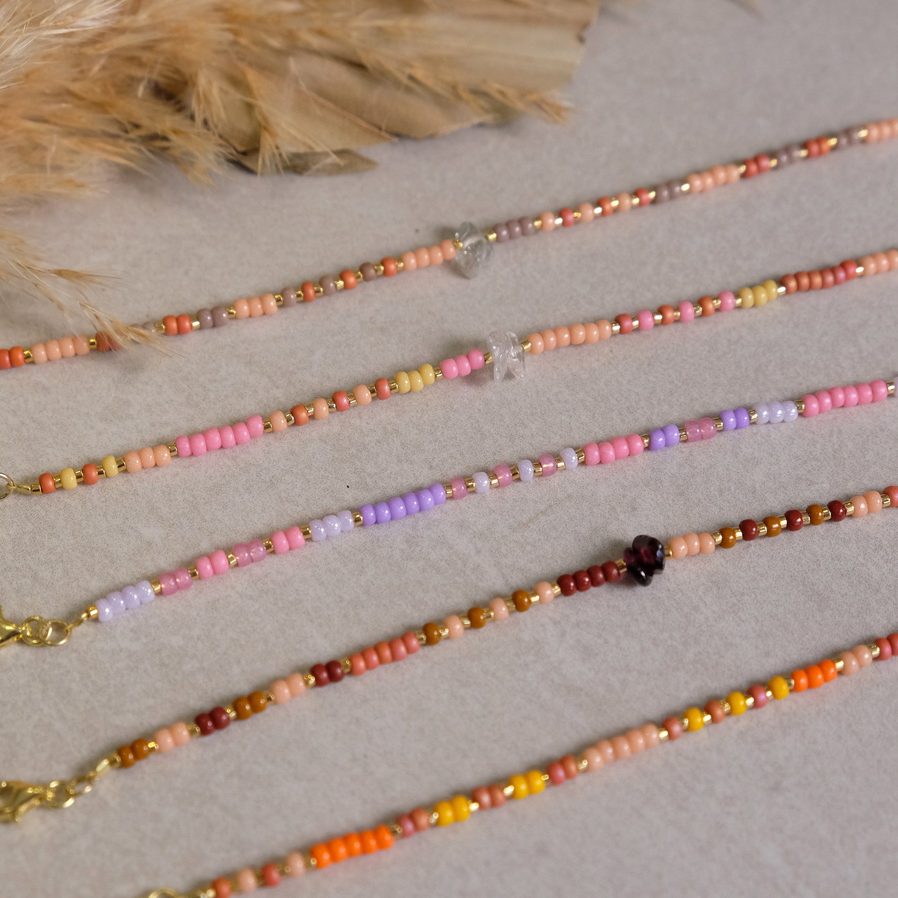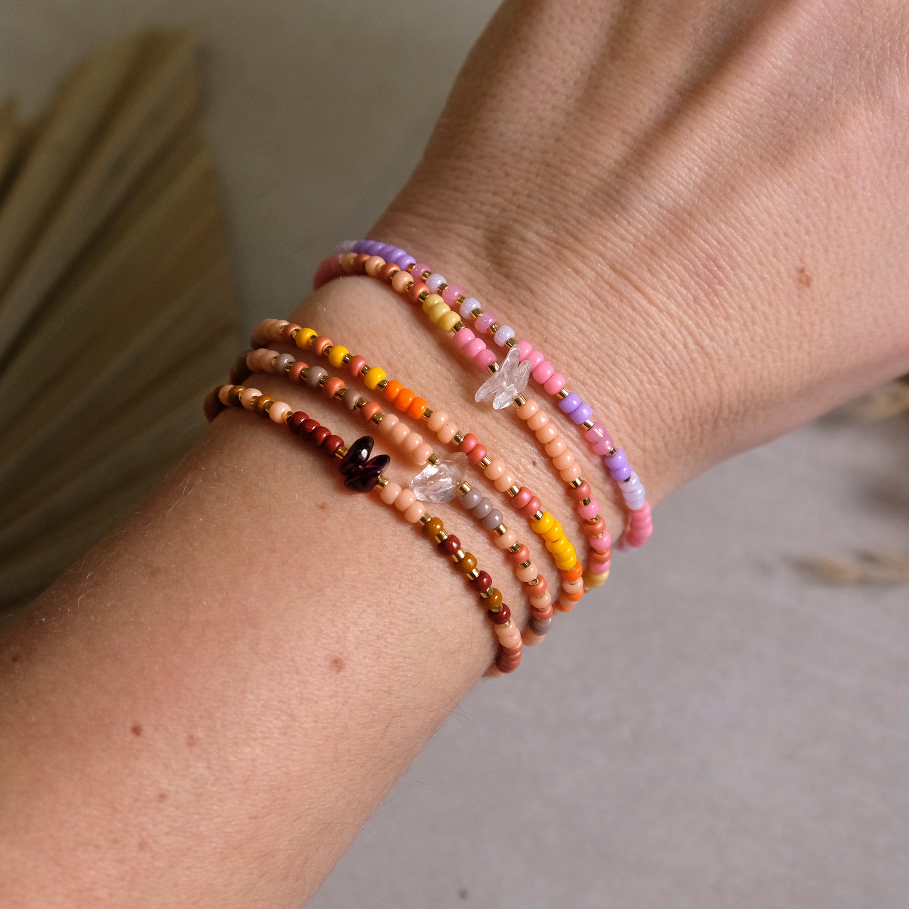 Jedes Armband wird liebevoll von Hand gefertigt und vereint zarte Glasperlen mit ausgewählten Edelstein-Akzenten. Die warmen Farben, sanften Pastelltöne und natürlichen Nuancen erinnern an Sommer, Leichtigkeit und gute Energie.